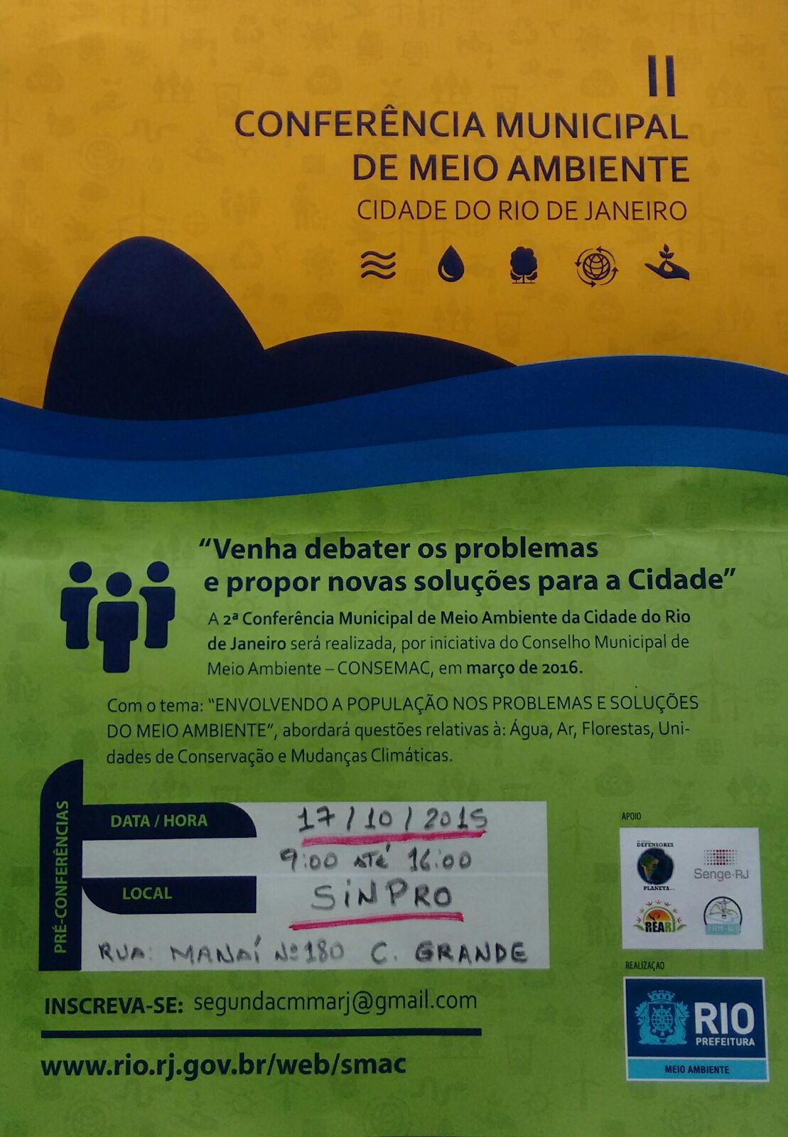 No dia 17 de outubro de 2015, foi realizada no SINPRO, em Campo Grande a Pré conferência municipal de meio-ambiente da zona oeste. A pré conferência e uma previa para a segunda conferência municipal do meio ambiente que acontece este ano, a segunda etapa da conferencia só se realizará por iniciativa do CONSEMAC – Conselho municipal do meio ambiente do Rio de janeiro, com o seguinte tema: “Envolvendo a população nos problemas e soluções do meio ambiente”, abordará questões relativas à: Água, Ar, Floresta, Unidades de conservação e Mudanças climáticas, na Coordenação das pré – conferências e segunda conferência estão as seguintes organizações: Fam –Rio, Defensores do Planeta, Senge, Rearj e SMAC.